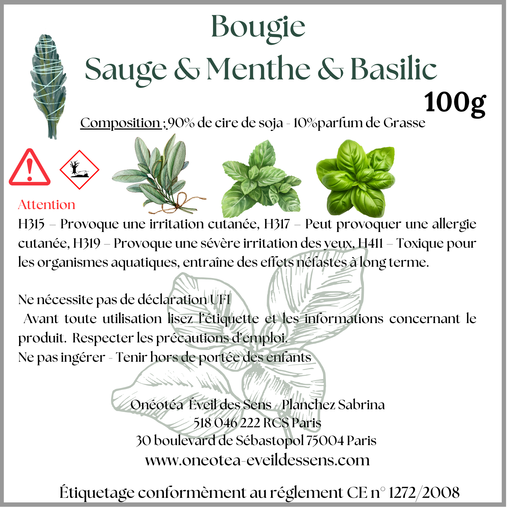 En choisissant la Bougie Sauge Menthe Basilic, vous optez pour une qualité exceptionnelle et une fabrication responsable. Chacune de nos bougies est conçue avec amour, dans le respect de l'environnement. Nous nous engageons à offrir des produits qui non seulement améliorent votre qualité de vie, mais qui se soucient aussi de la planète.