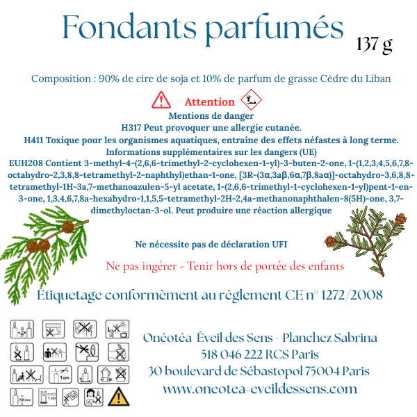 • Composé de 90% de cire végétale de soja - 10% de parfum de Grasse Cèdre du Liban
