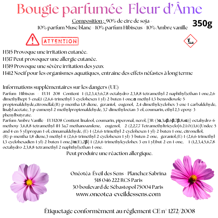 - Chaque bougie contient de la cire de soja 90%, 10% de parfum de Grasse Musc Blanc & Hibiscus & Ambre Vanille